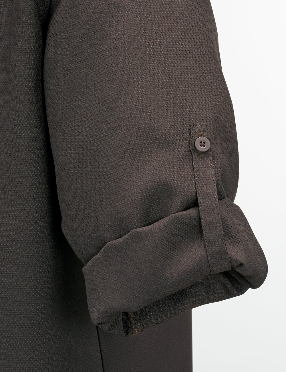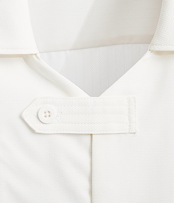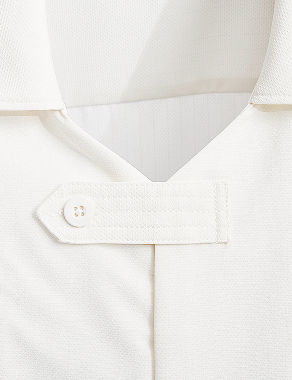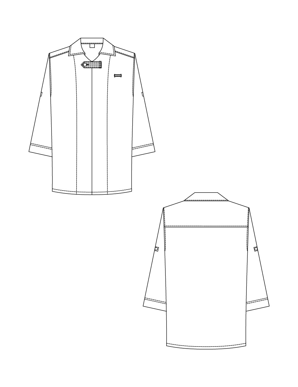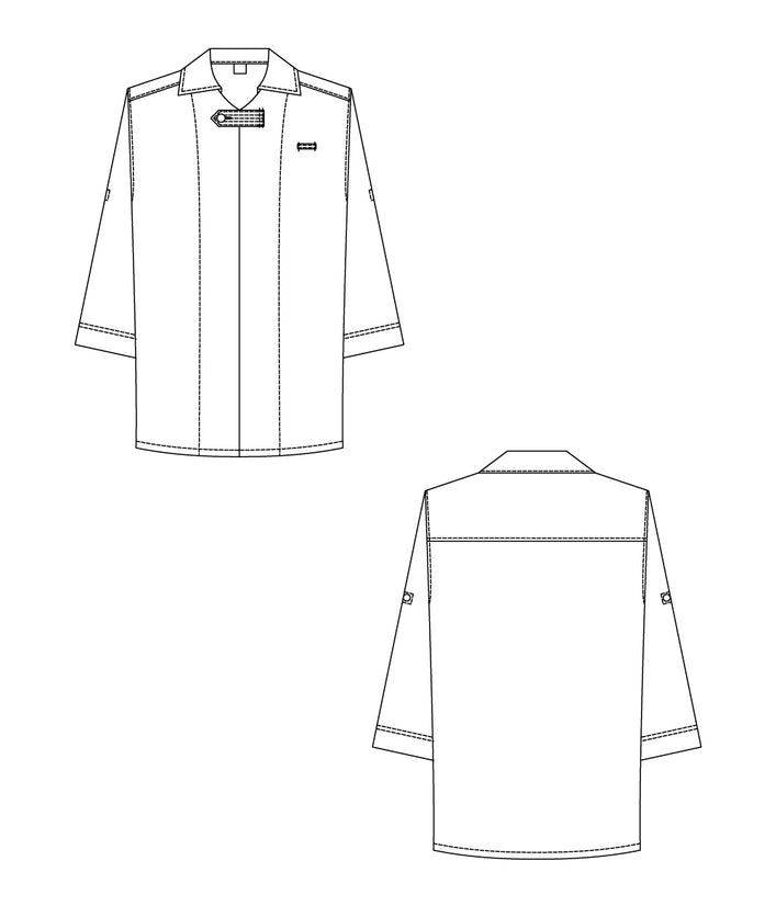 台衿のない大きな衿と、タイループにもなる前タブが特徴のデザインシャツ。