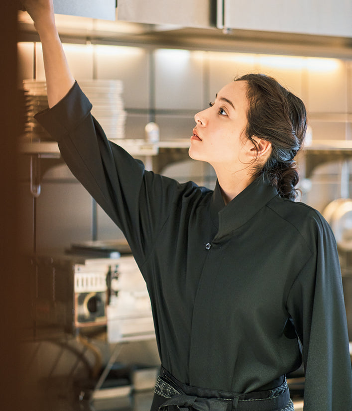 着こなしが綺麗に仕上がるハリ感をプラスした次世代パワーファブリック。襟元が綺麗にキマるスタンドカラーシャツはシャープな印象で、キッチンから接客まで幅広いシーンに