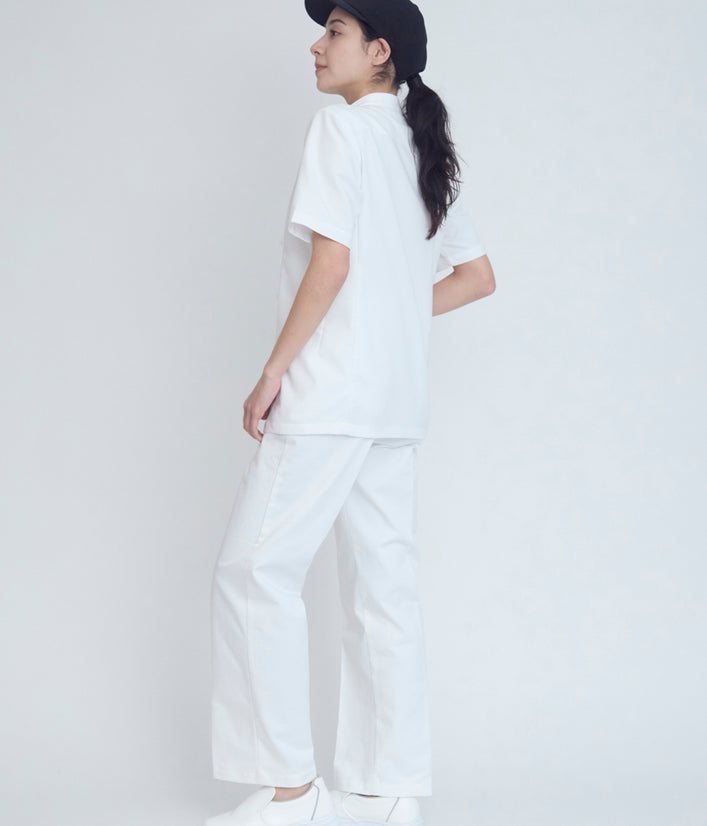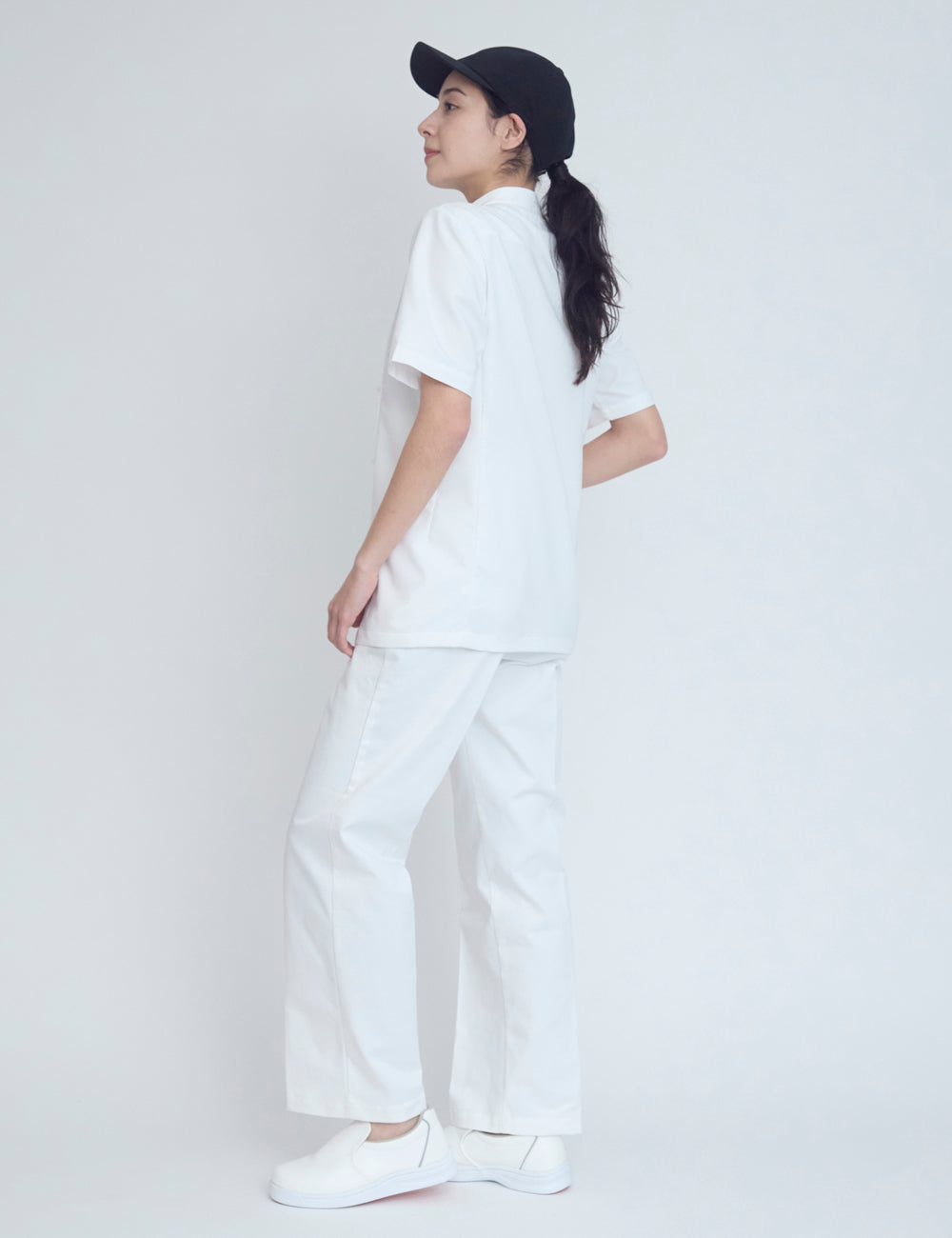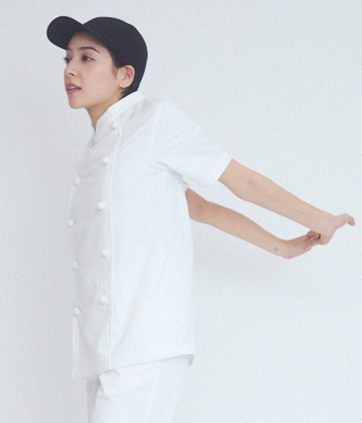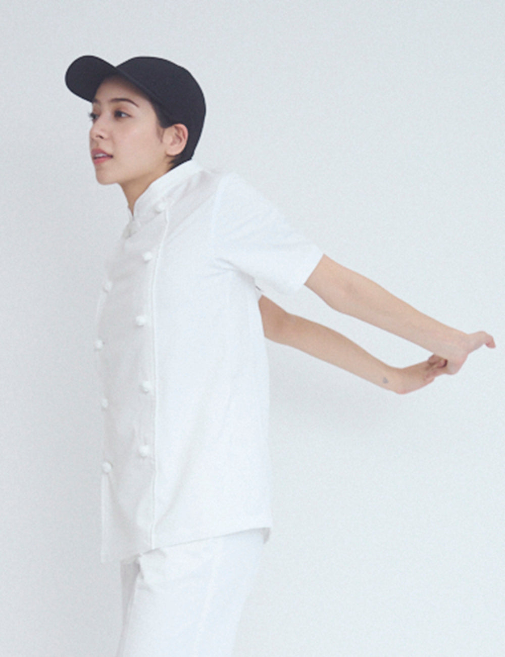 従来のカツラギのコックコートに比べて約半分の重さ。(当社比)肌への接触面は立体構造になっており、べたつかずサラッとした着用感をキープする