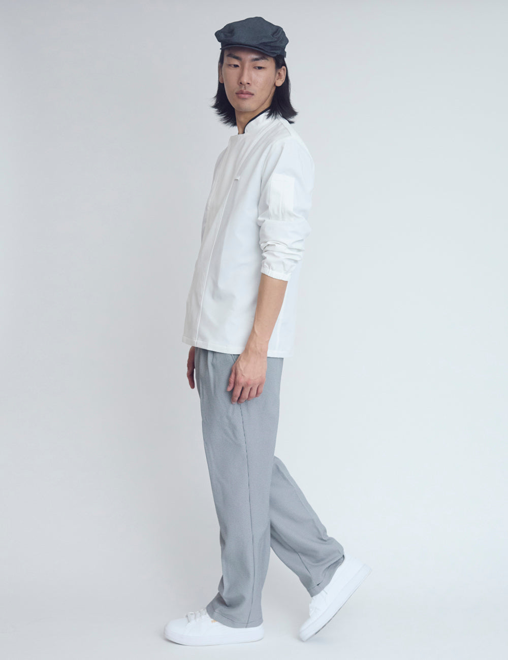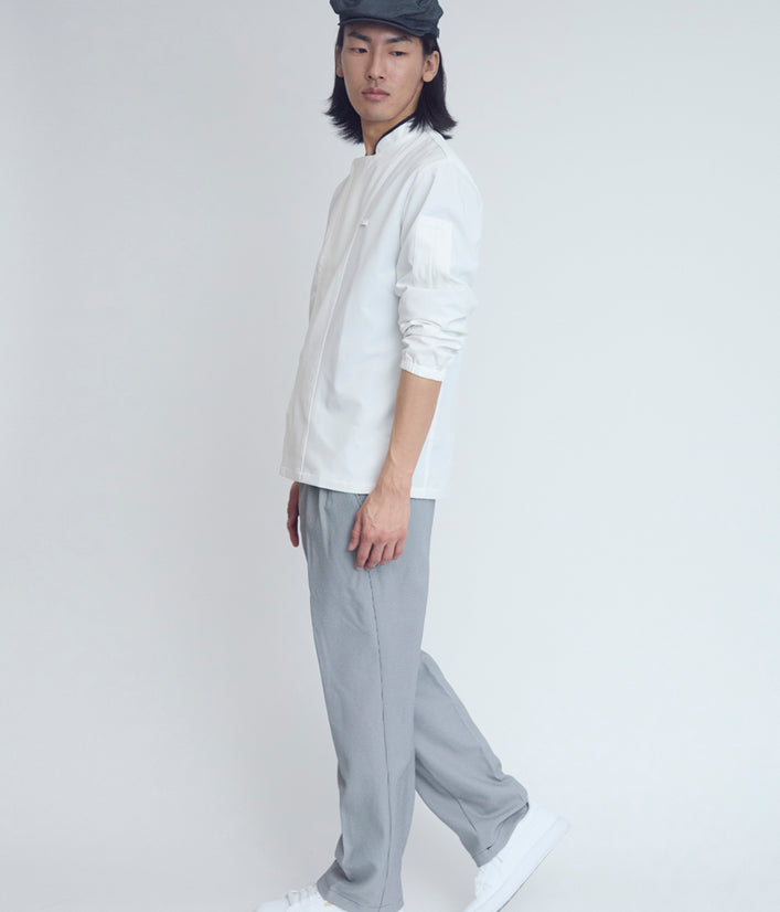 現場の声から生まれた、ストレッチ性と軽さが特徴のZEROコート。従来のカツラギのコックコートに比べて約半分の重さ。(当社比)肌への接触面は立体構造になっており、べたつかずサラッとした着用感をキープする自社開発のゼロハニカム素材を採用。夜洗えば朝には乾いているイージーケアな人気商品。