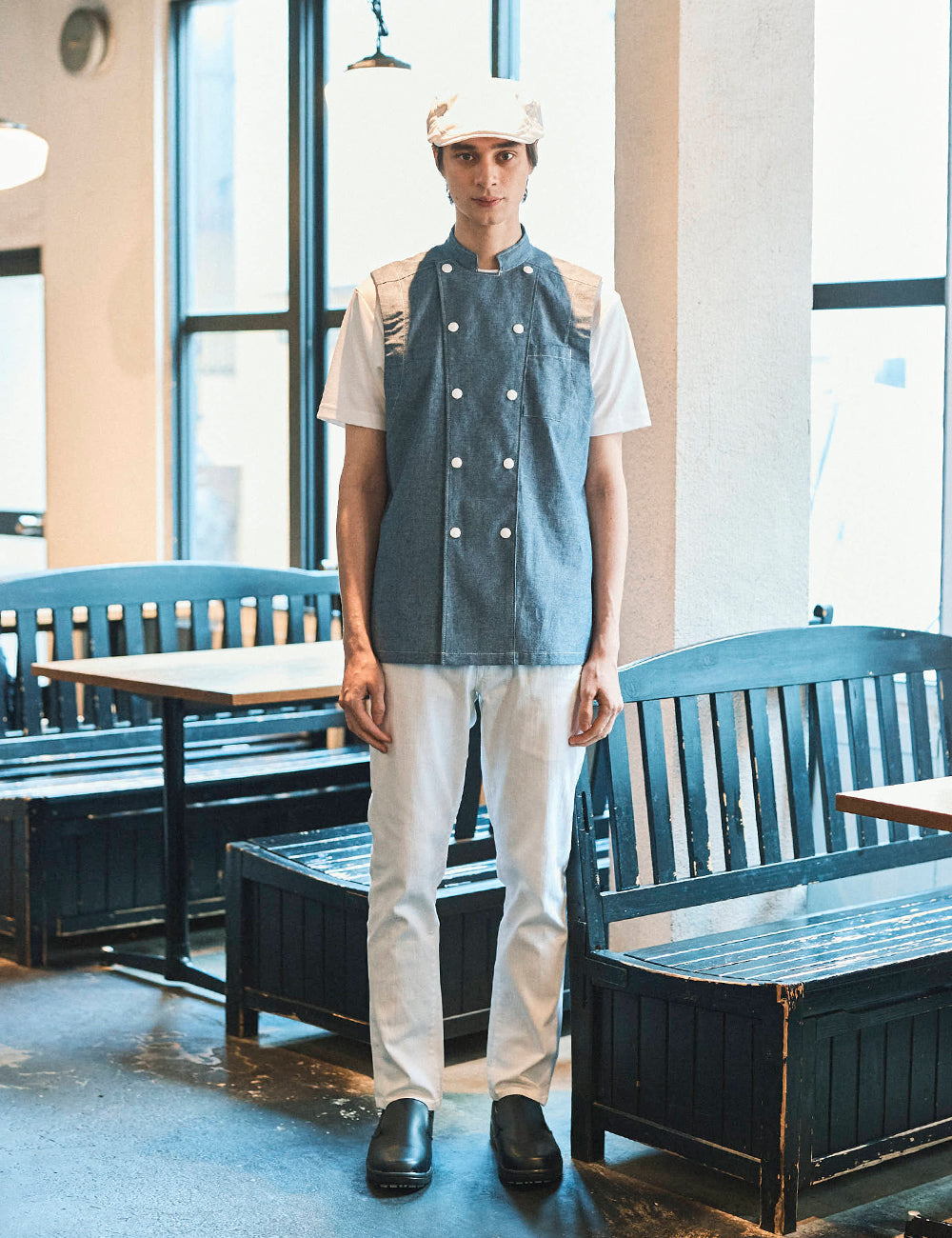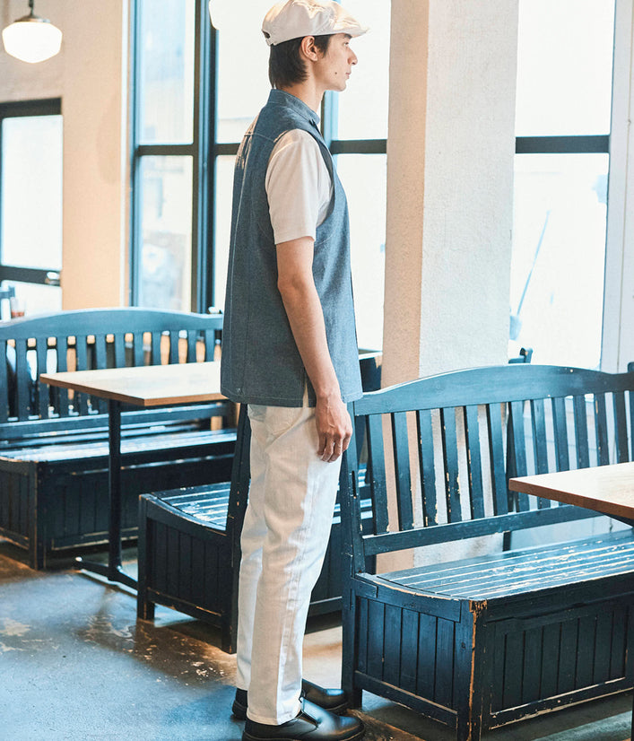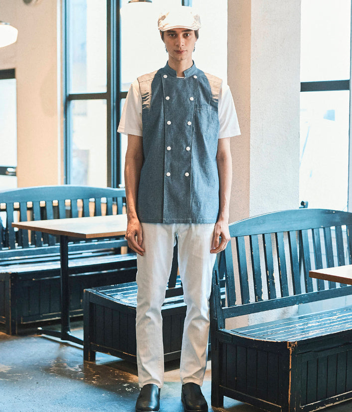 確保。高機能な東レ ライトフィックス®︎ワッフルとカジュアル性の高いインディゴダンガリーの2タイプをご用意。さらに暑さを軽減させ、厨房の白を強調する