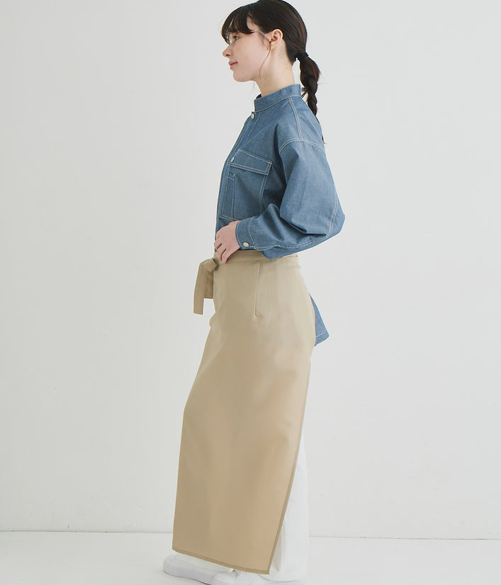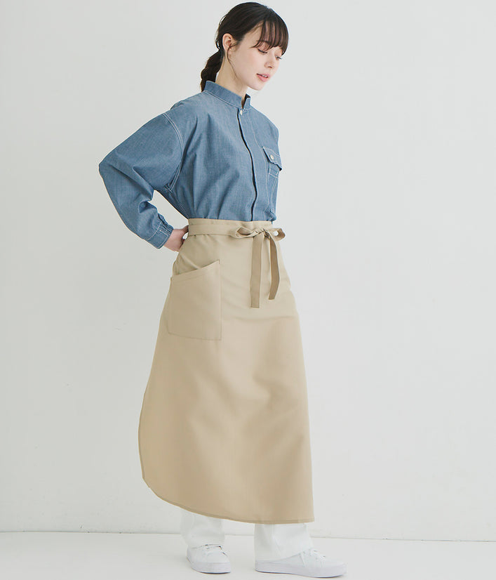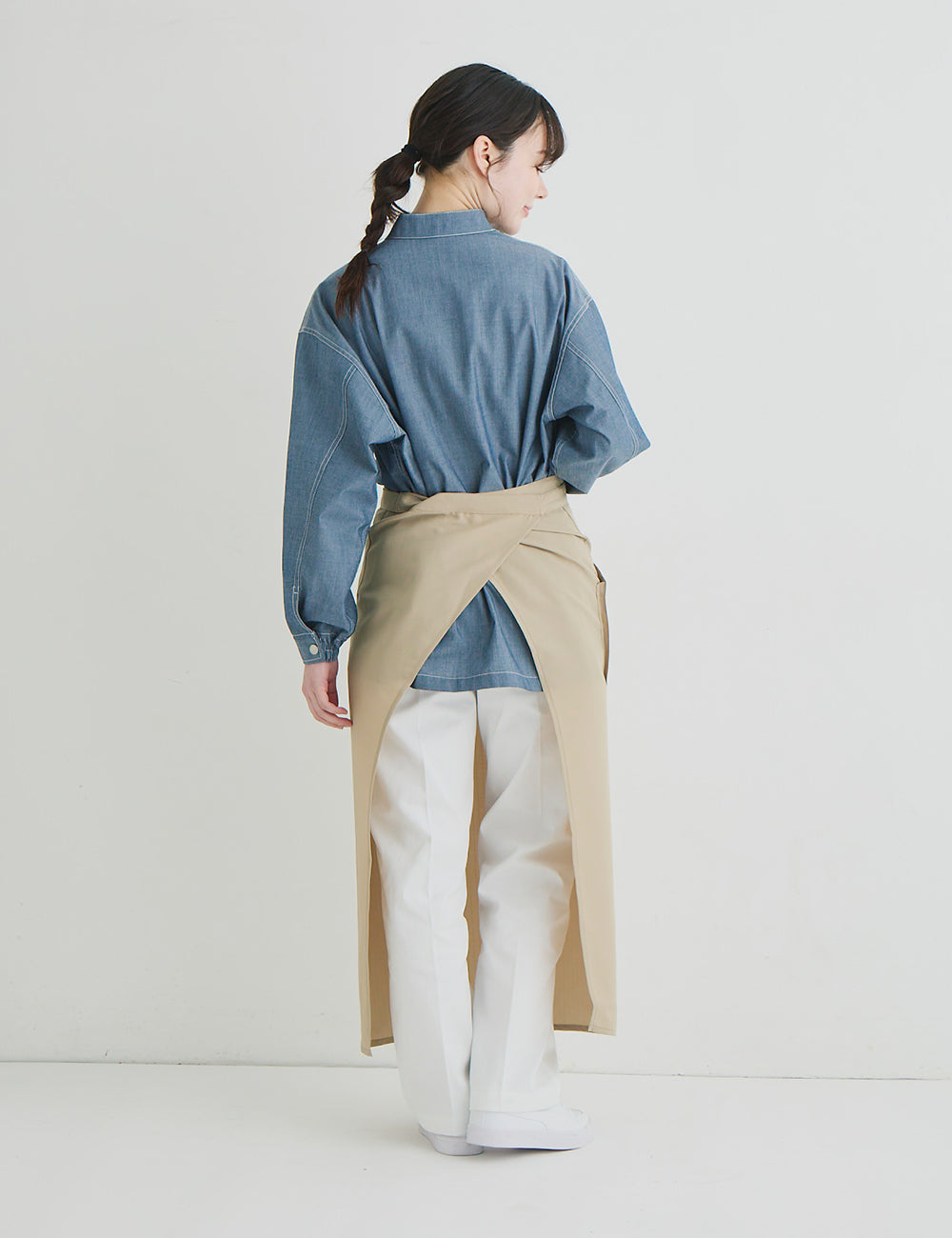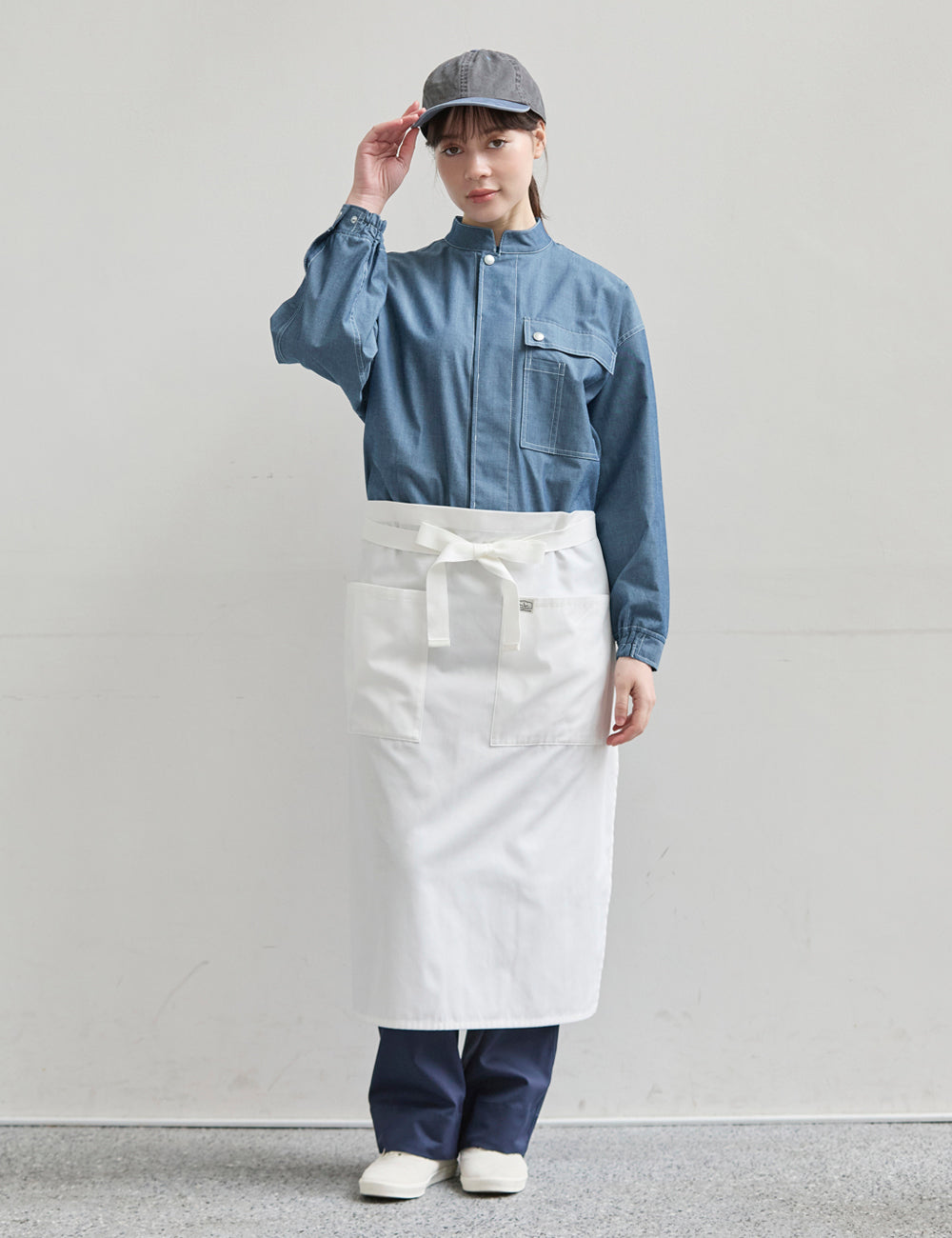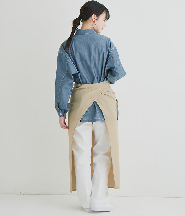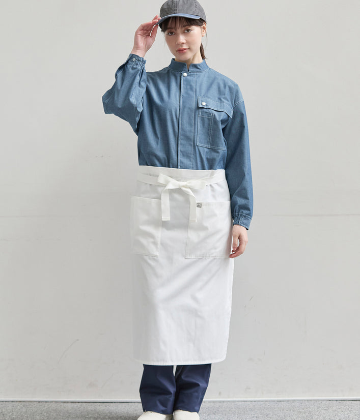 キッチンでもホールでもマルチワークに最適なショップコートはダンガリーでカジュアルさをプラス。トレンドのオーバーサイズデザインはニコアンドの得意