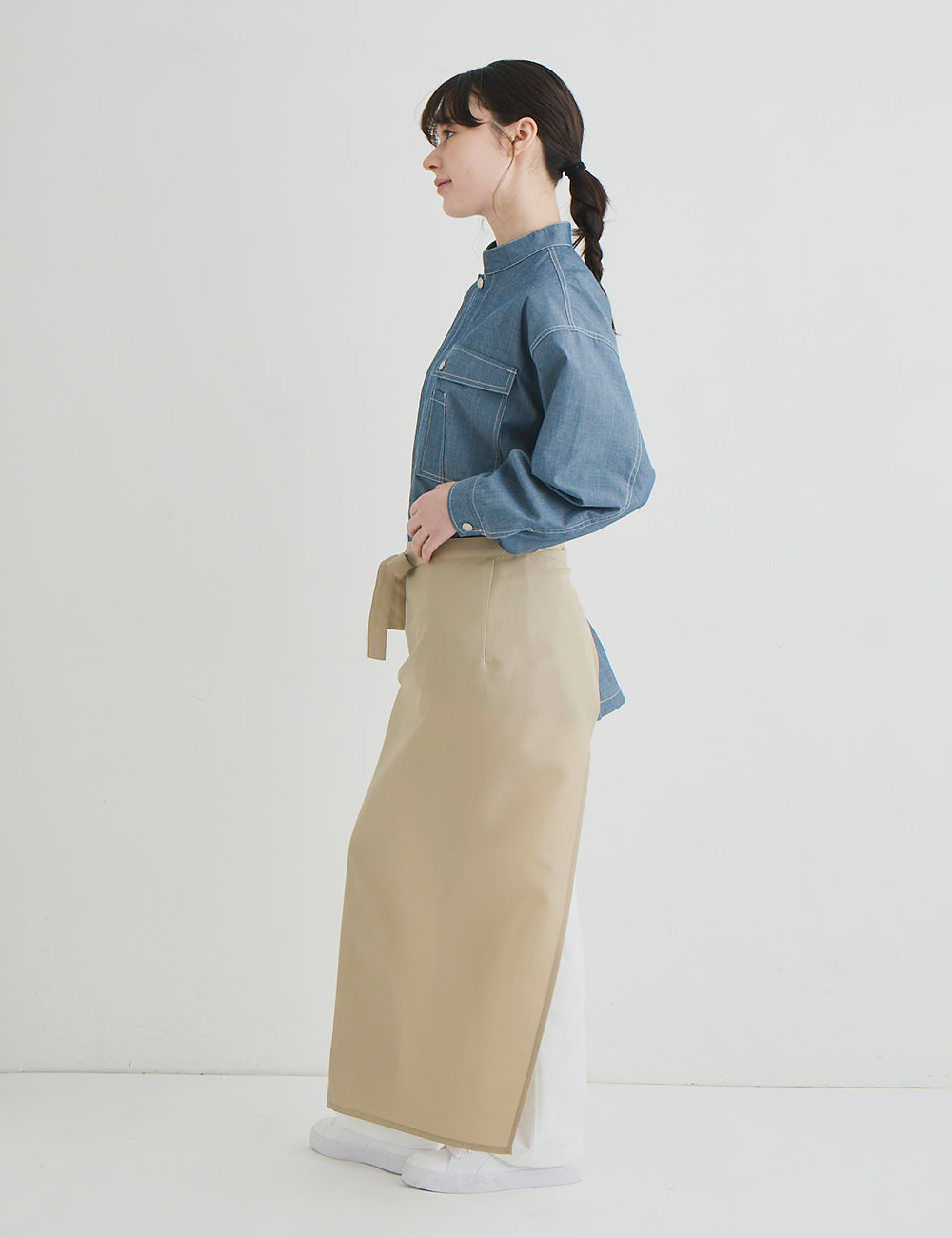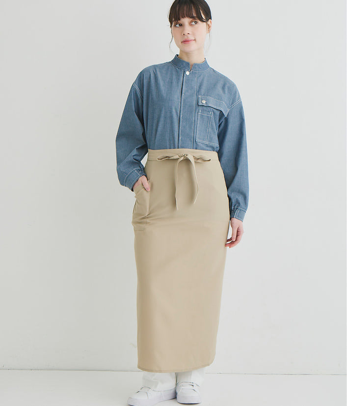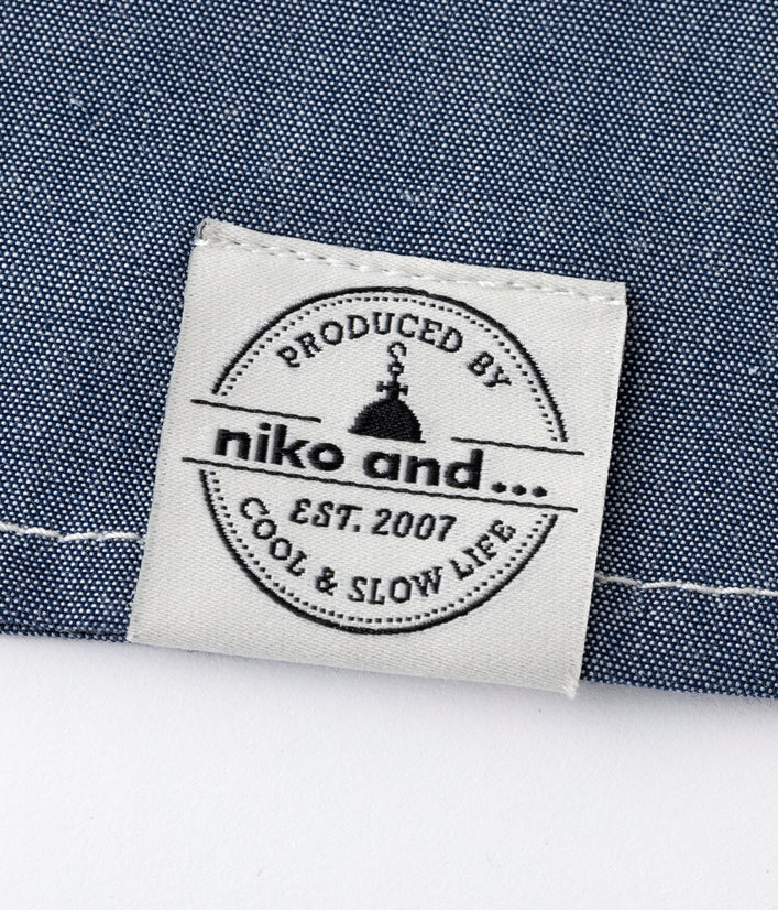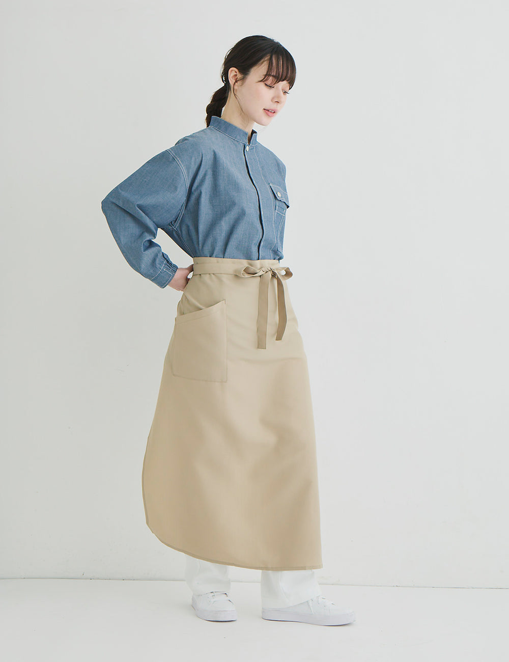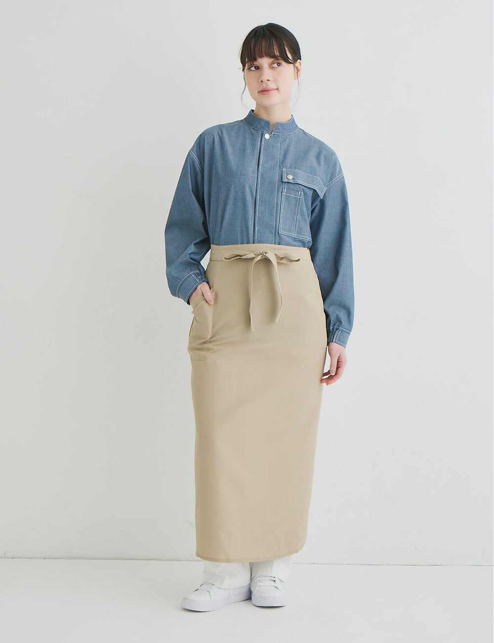 キッチンでもホールでもマルチワークに最適なショップコートはダンガリーでカジュアルさをプラス。トレンドのオーバーサイズデザインはニコアンドの得意