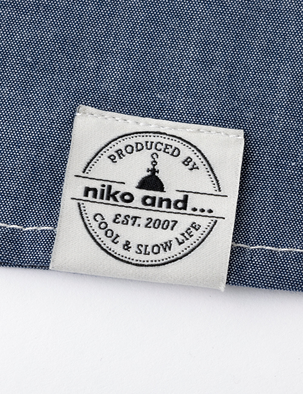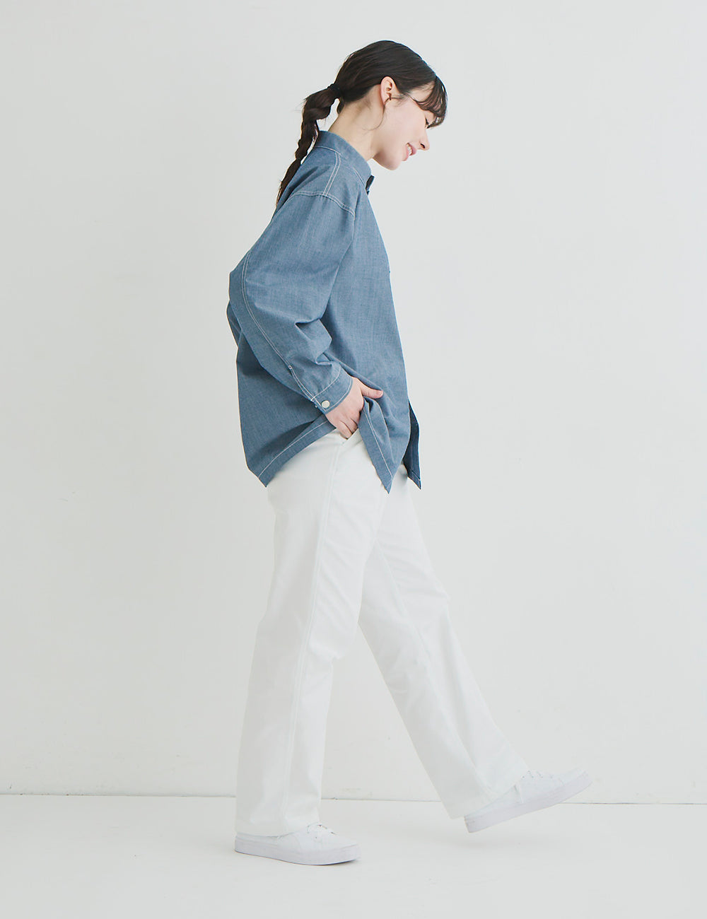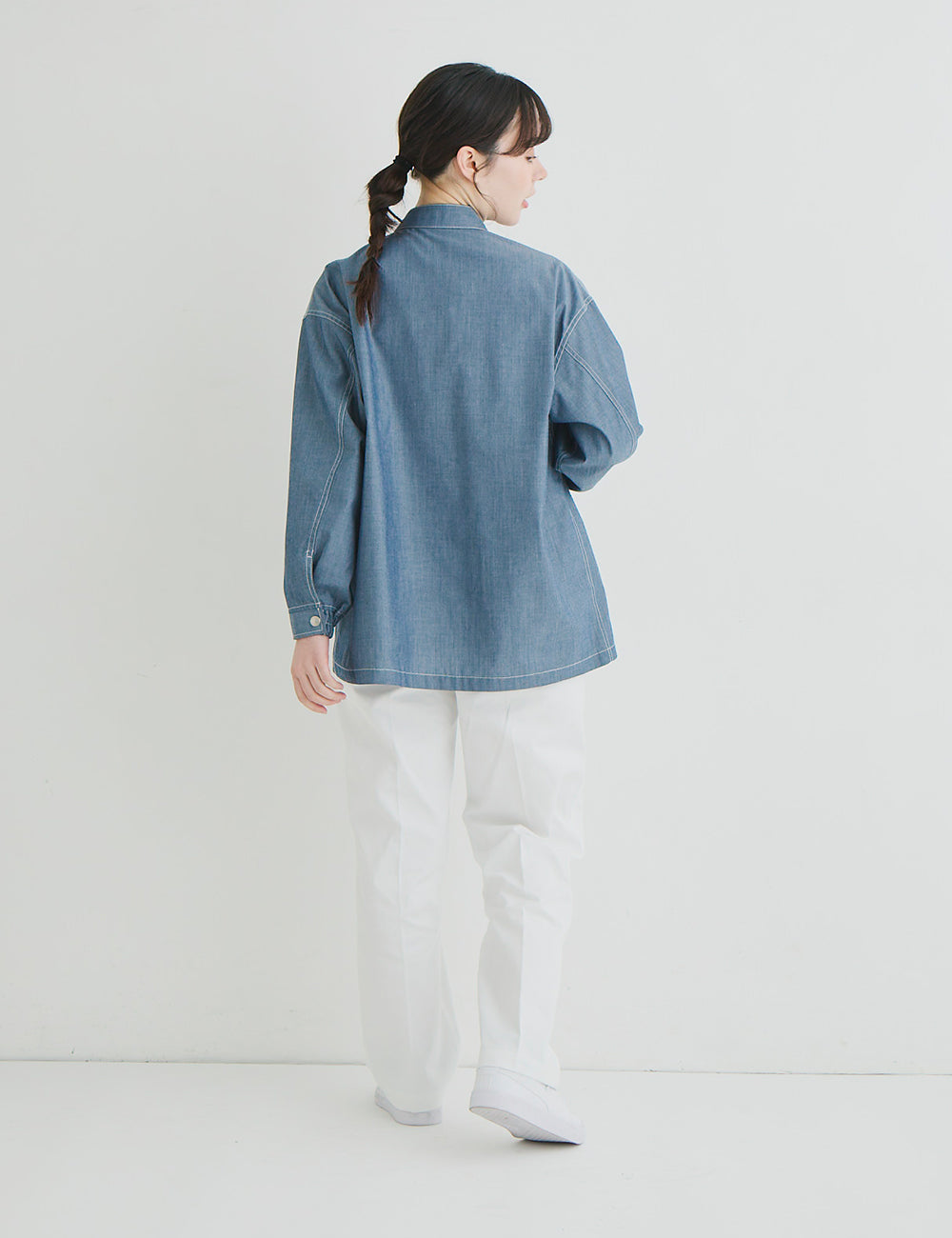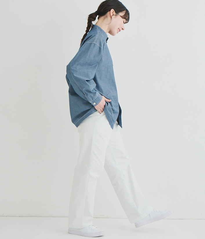キッチンでもホールでもマルチワークに最適なショップコートはダンガリーでカジュアルさをプラス。トレンドのオーバーサイズデザインはニコアンドの得意