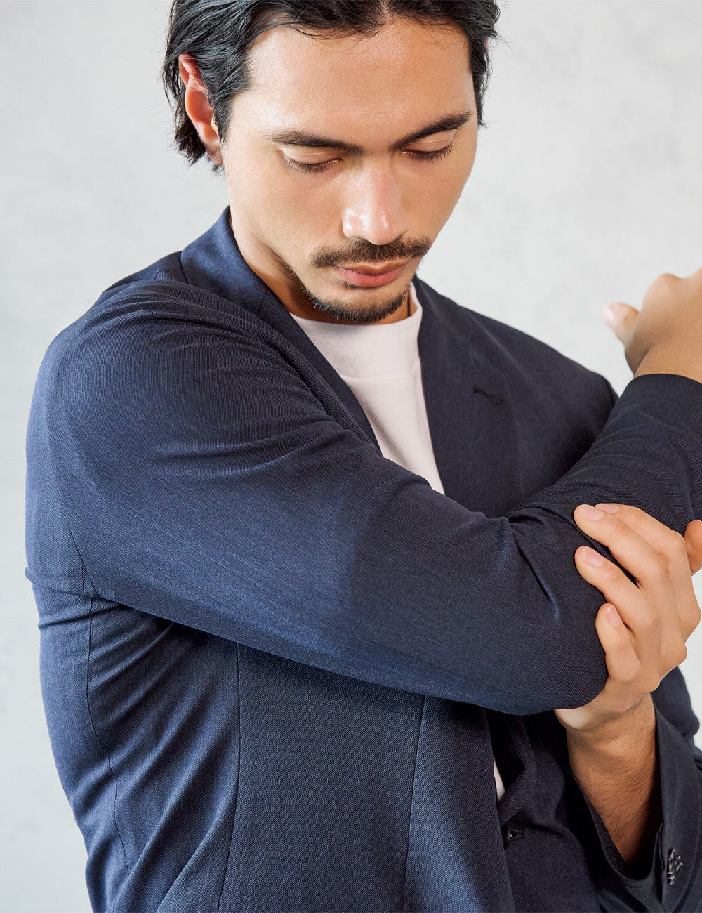 一見フォーマルな印象の上品な表面感のある素材は、実は伸縮性の高いストレッチといったきちんと見えの動ける高機能素材。薄く柔らかな肩パッドが、素材の