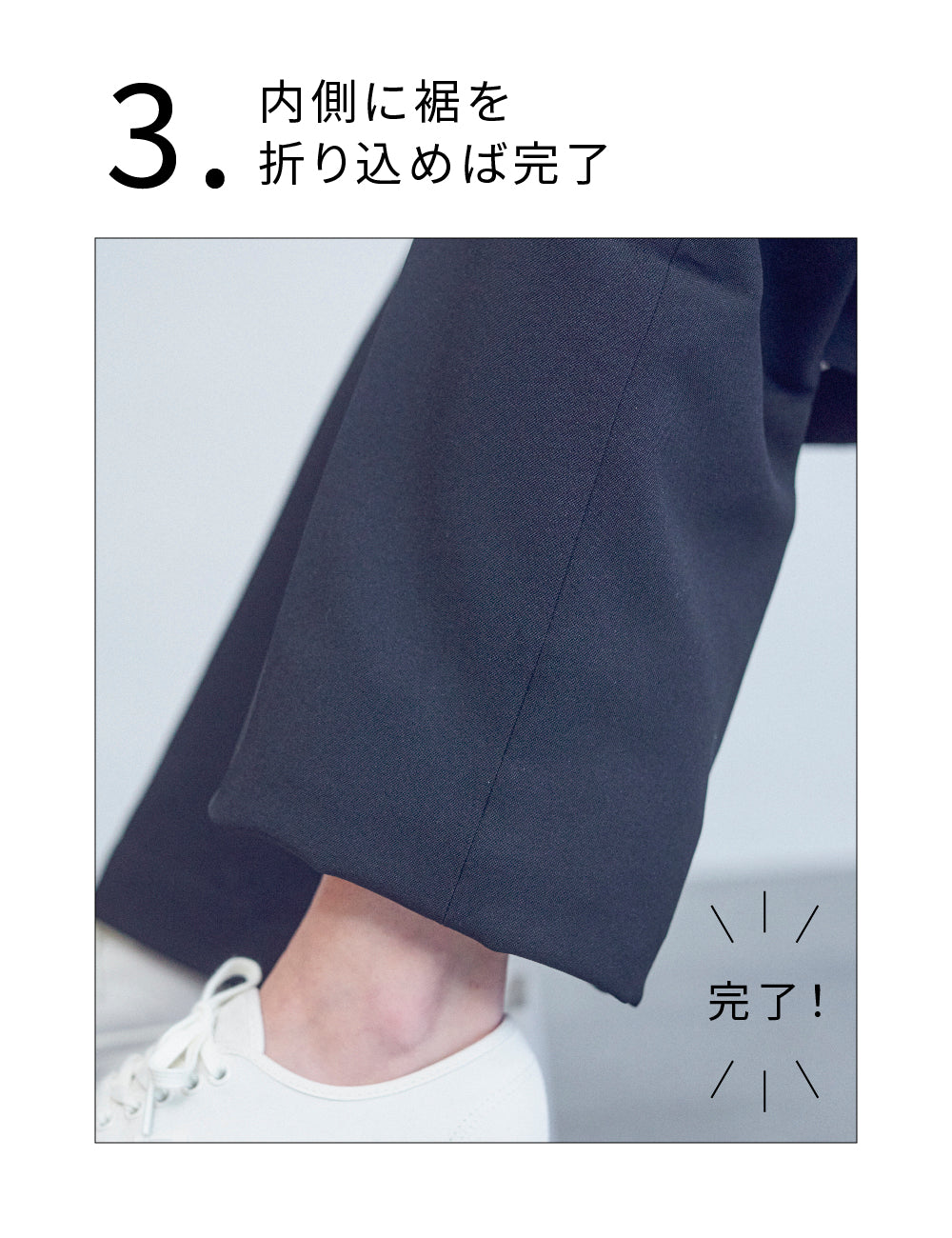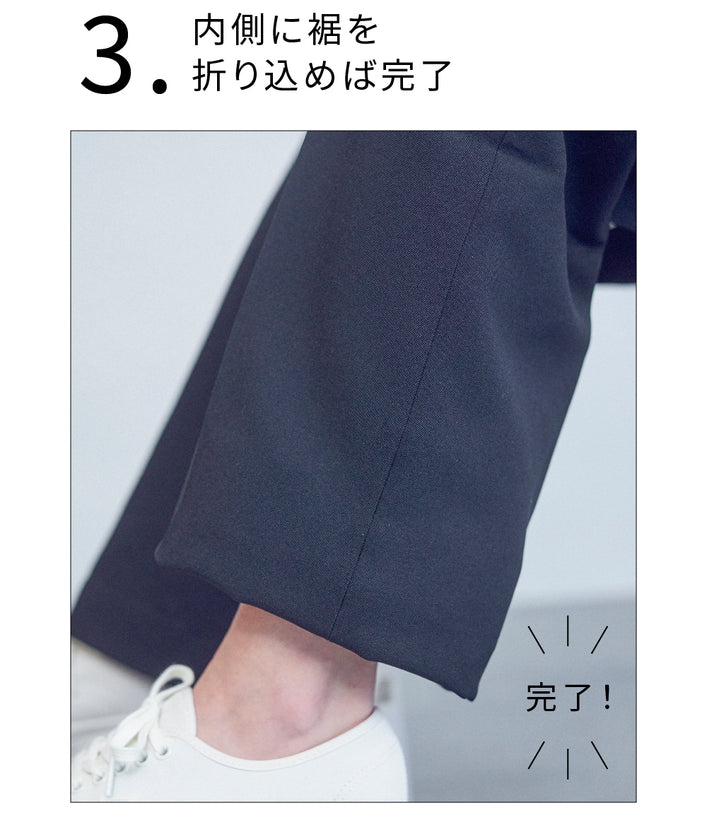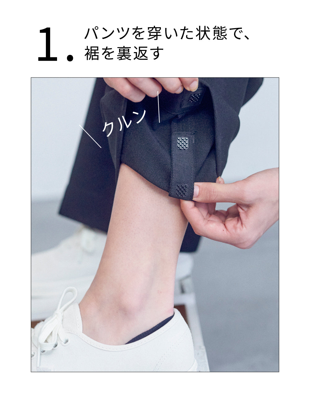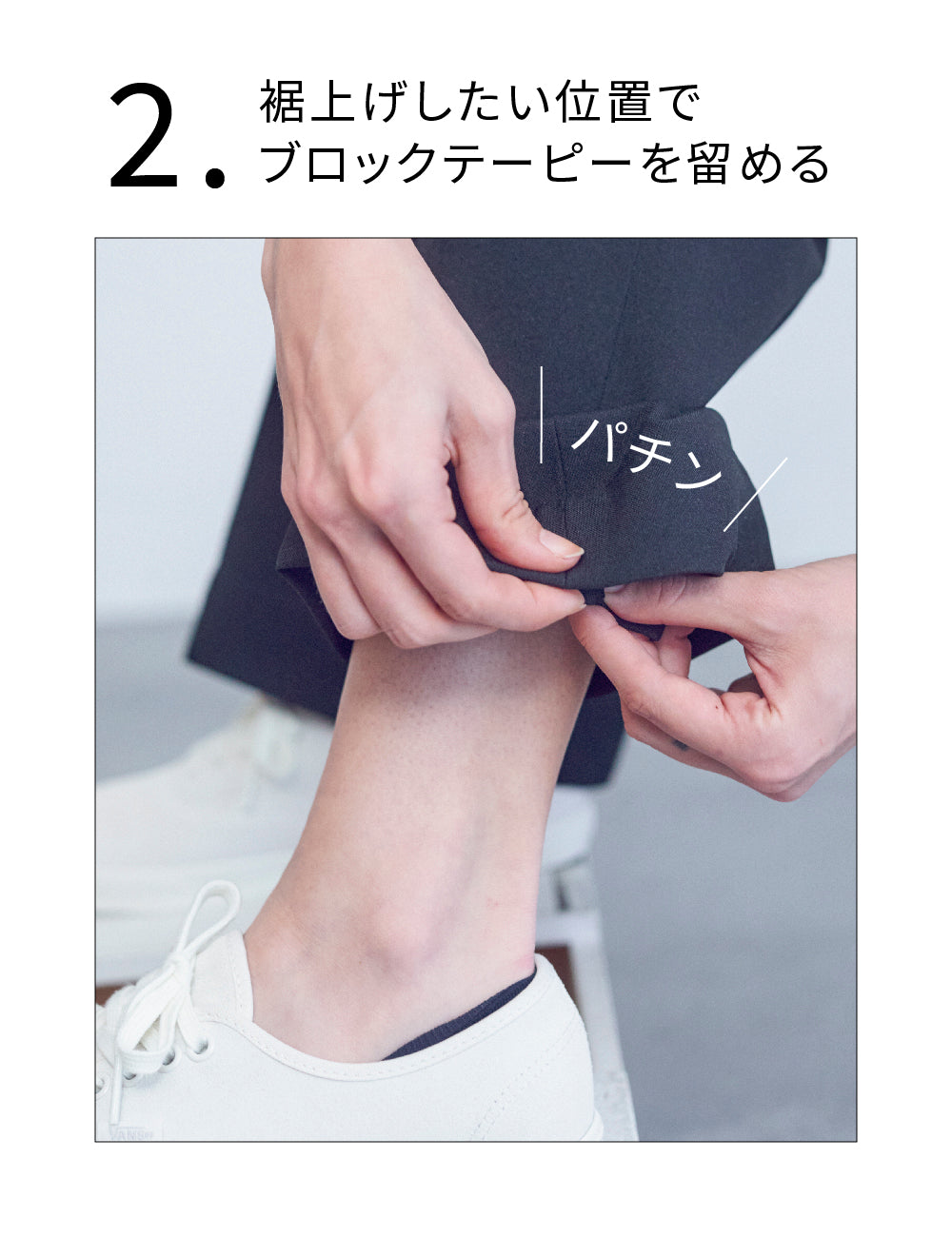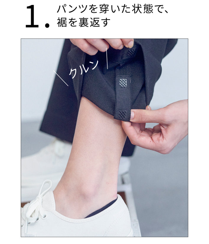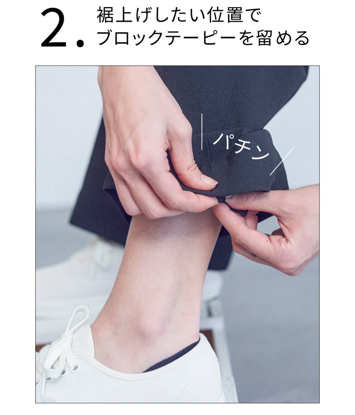 裾上げ不要でその場で長さ調節できる簡単裾上げパンツ。内側のブロックテーピーを留めれば3〜5cm単位で3段階の調節ができ、一人一人のジャストな股下をカスタマイズ。