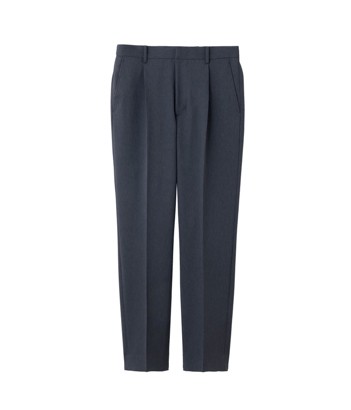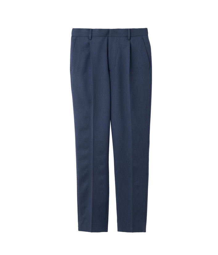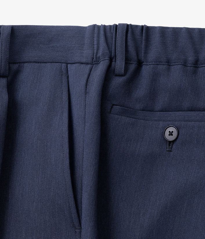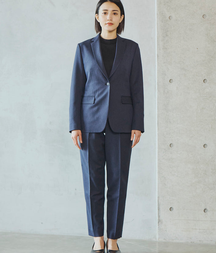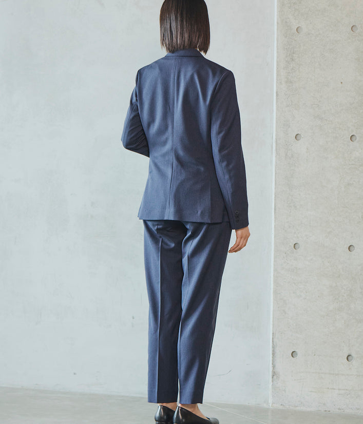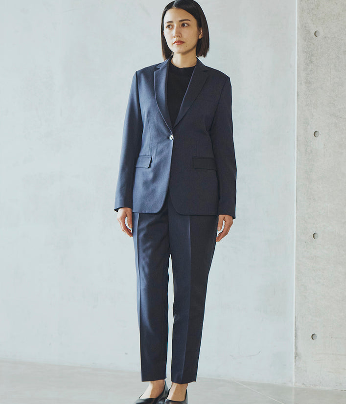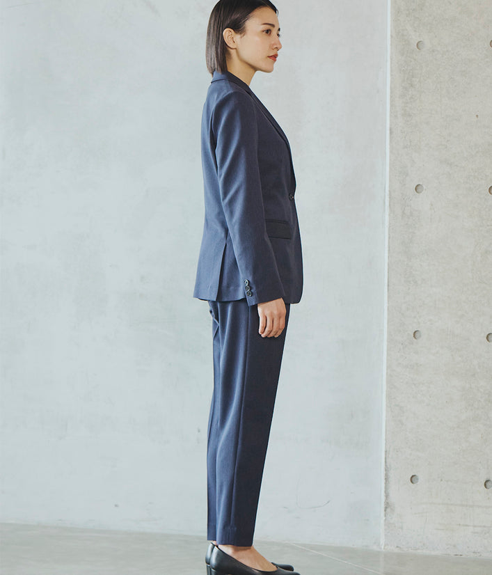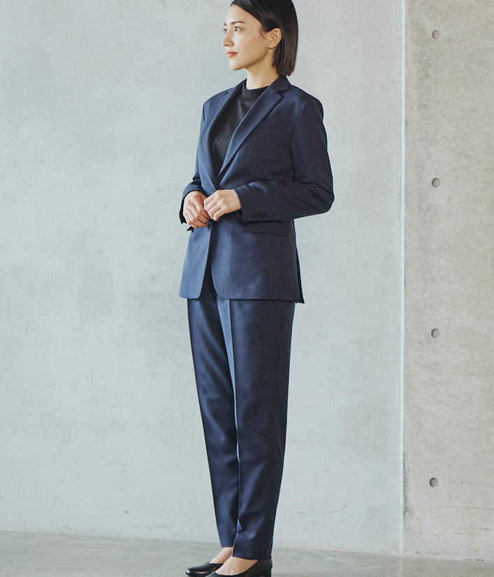 一見フォーマルな印象の上品な表面感のある素材は、実は伸縮性の高いストレッチといったきちんと見えの動ける高機能素材。お腹まわりのタックが程よくゆとりを