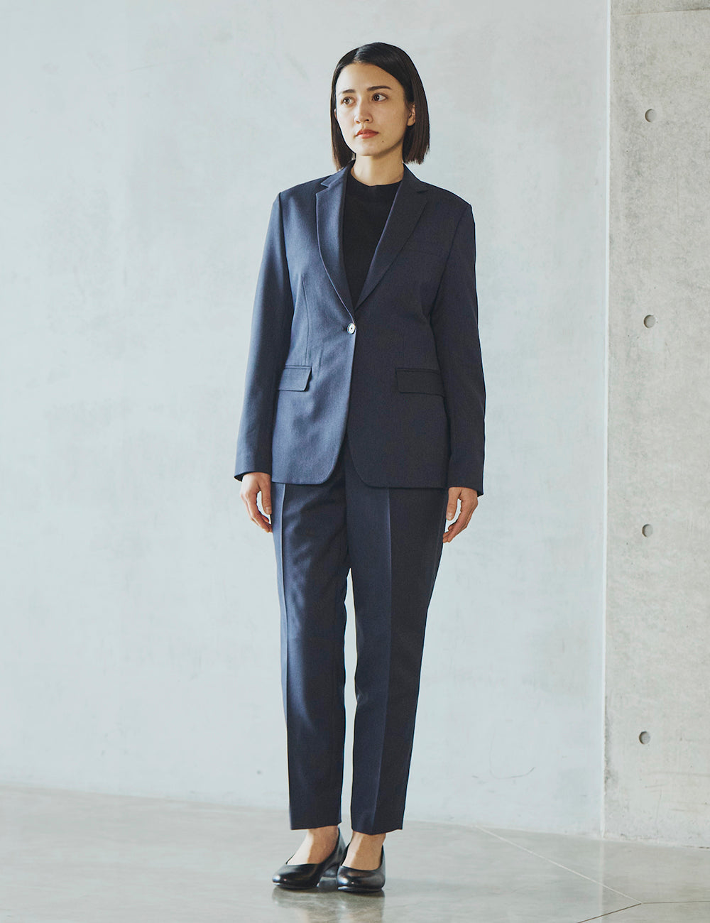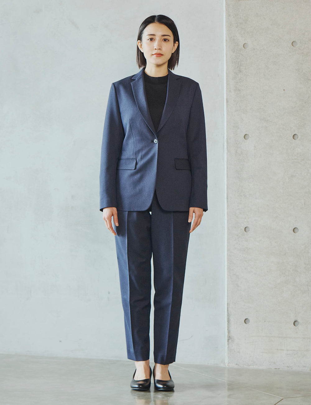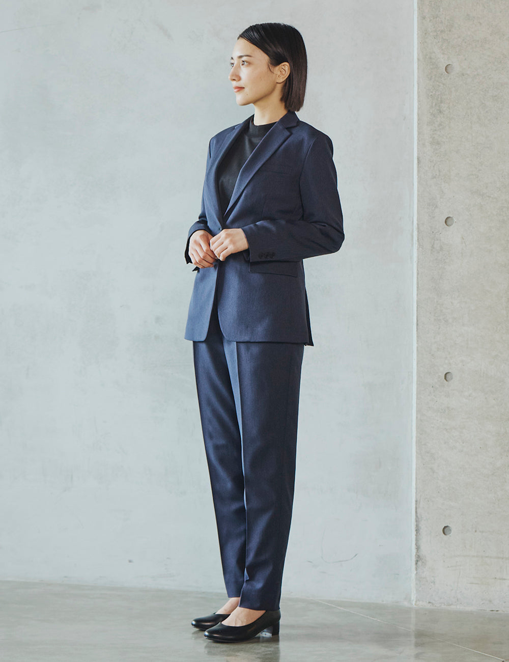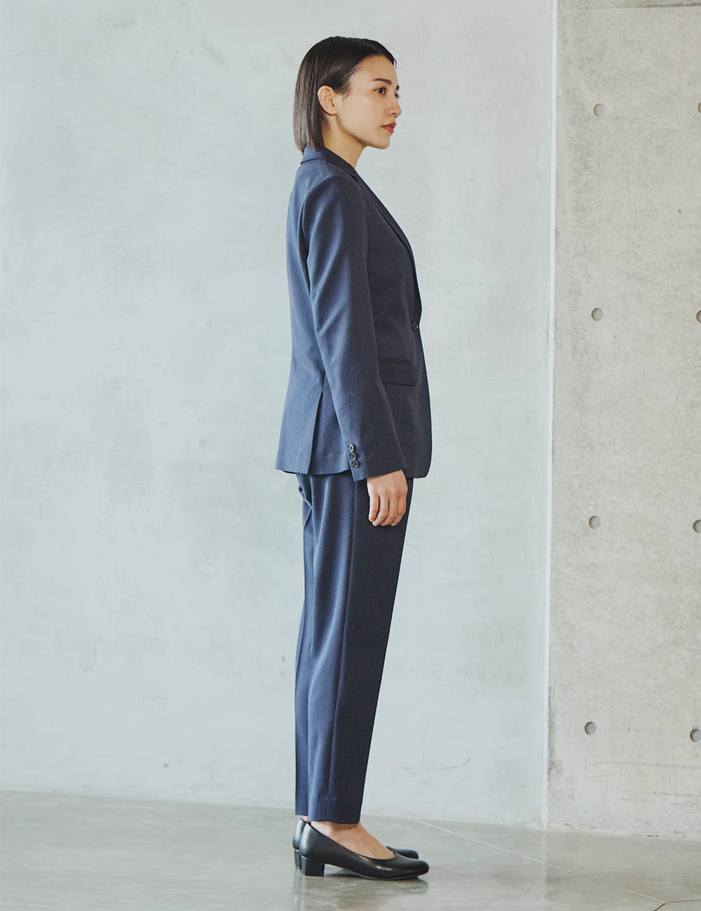 一見フォーマルな印象の上品な表面感のある素材は、実は伸縮性の高いストレッチといったきちんと見えの動ける高機能素材。お腹まわりのタックが程よくゆとりを