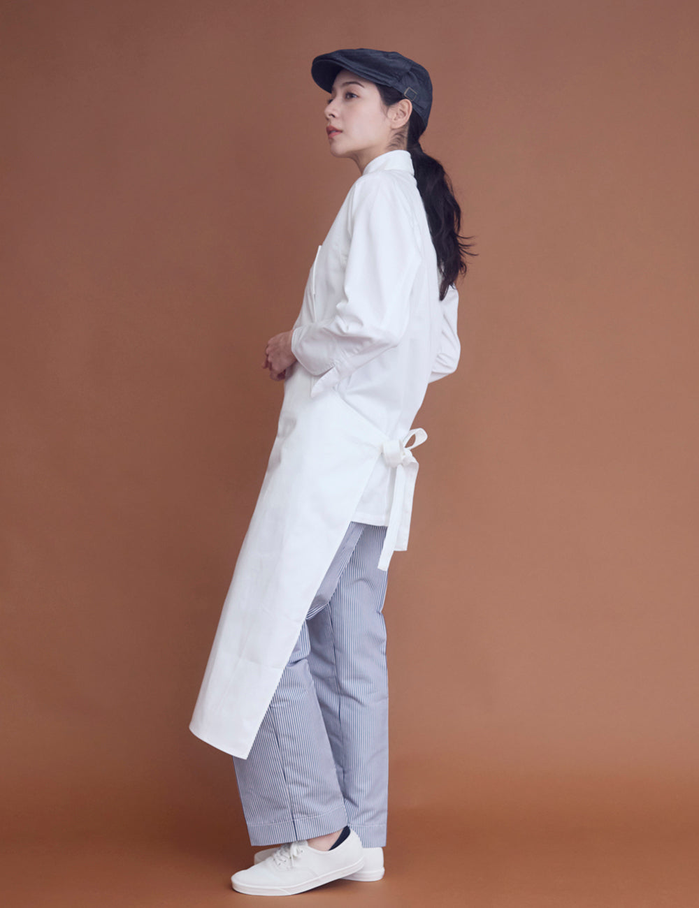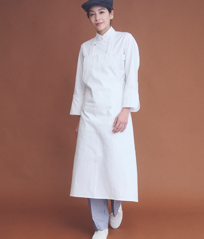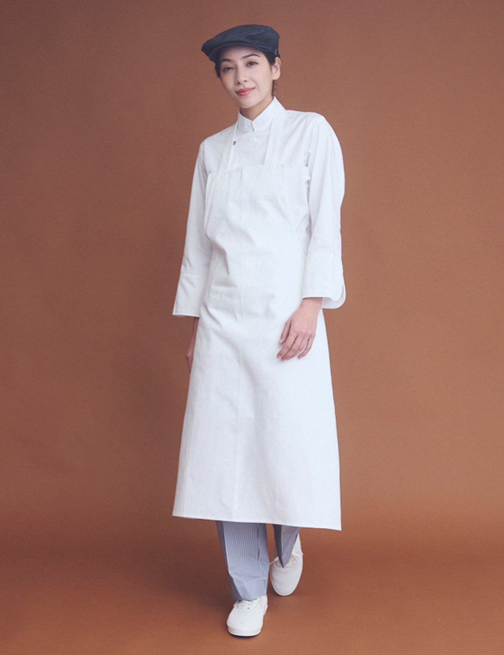 ベーシックな厨房用の白エプロン。忙しく働く事が多い厨房では、火に強い本格派エプロンがおすすめ。さっと着脱できる首かけタイプ。