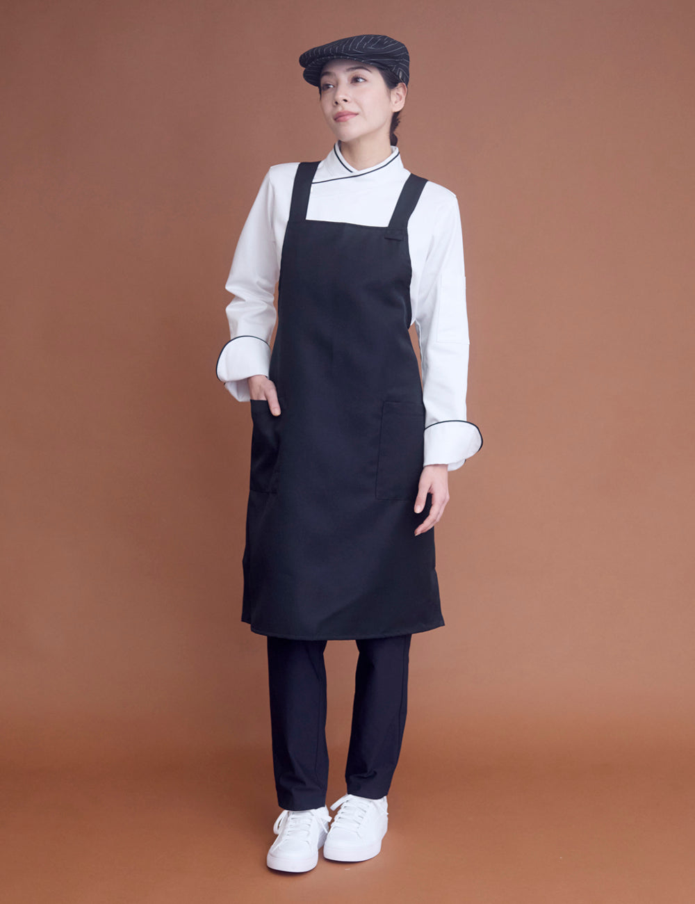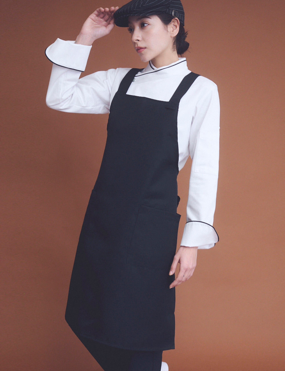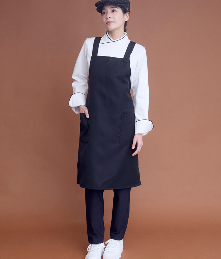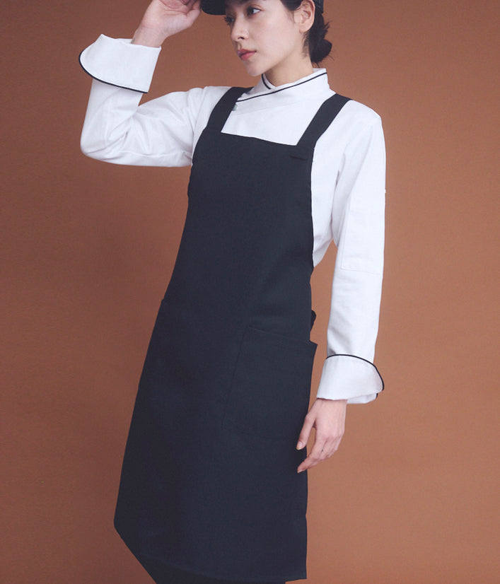 光沢感のあるツイルが特徴のベストプライスエプロン。サイズ調整がしやすく、肩ひものずれにくい後ろクロス仕様。最もベーシックなデザインで汎用性の高い1枚。