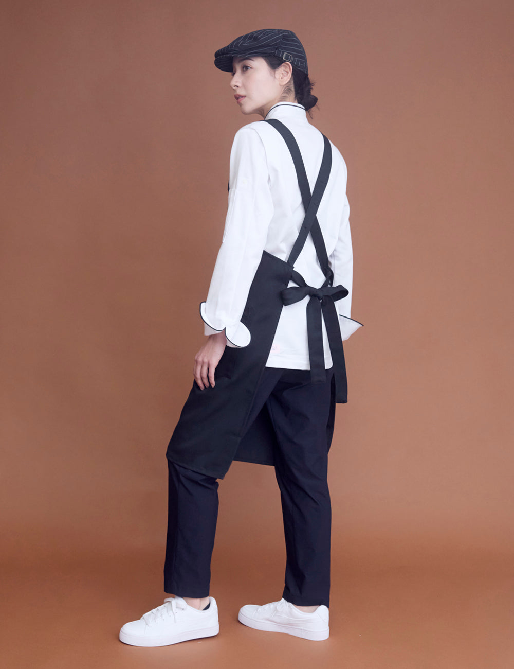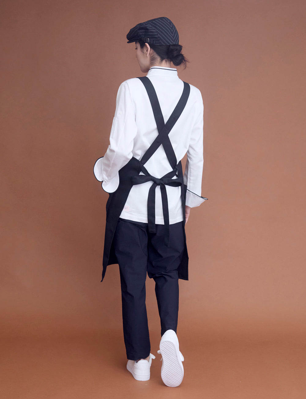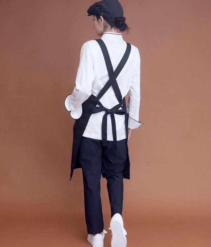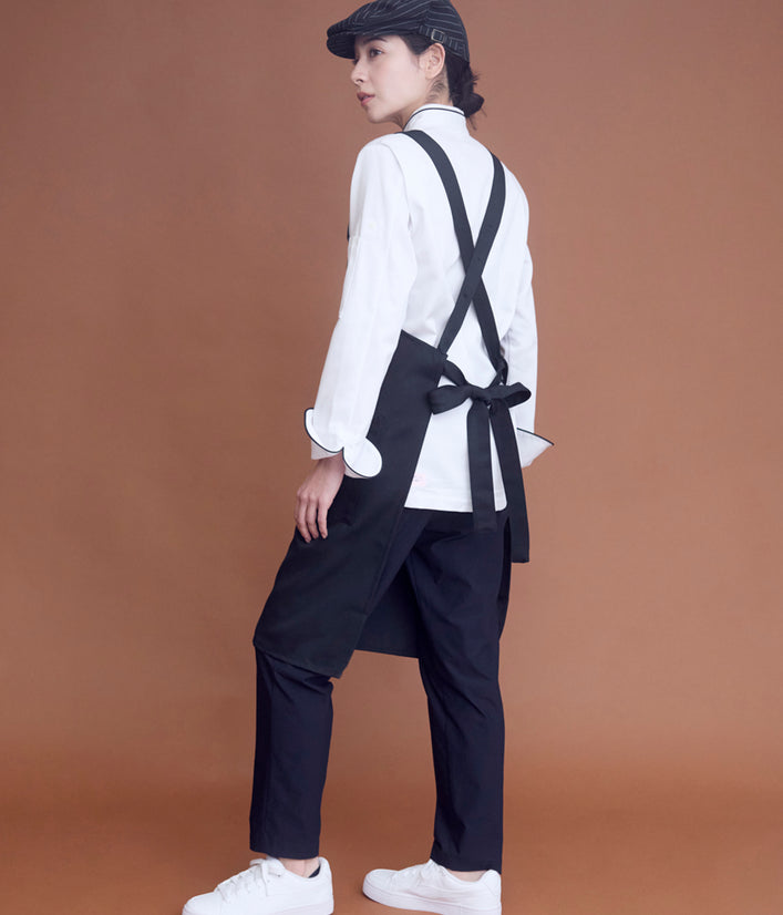光沢感のあるツイルが特徴のベストプライスエプロン。サイズ調整がしやすく、肩ひものずれにくい後ろクロス仕様。最もベーシックなデザインで汎用性の高い1枚。