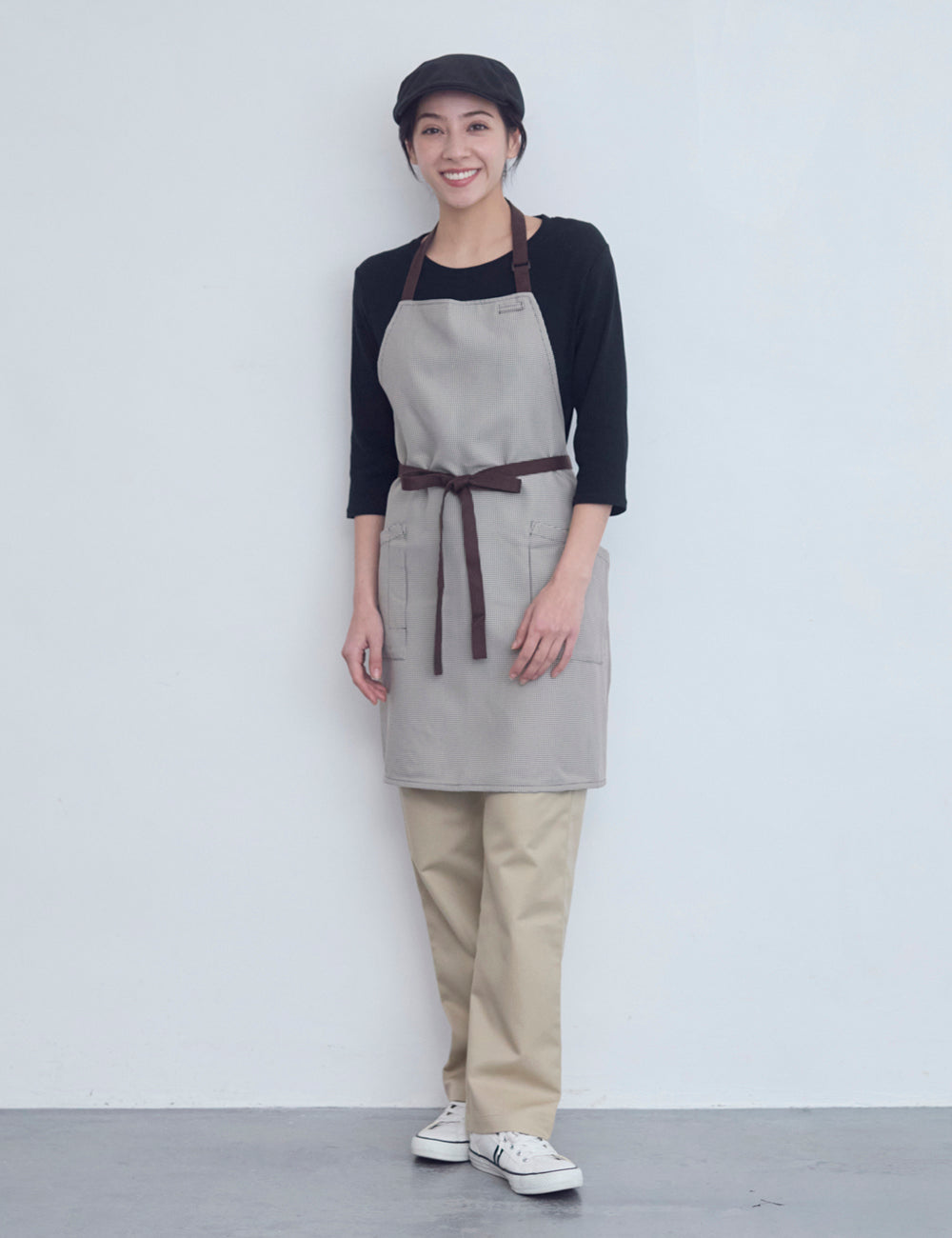 汚れの目立たないクラシカルな千鳥柄の首かけエプロン。配色の紐がデザインアクセント。ブラウンとブラックの2色の千鳥柄の色展開。