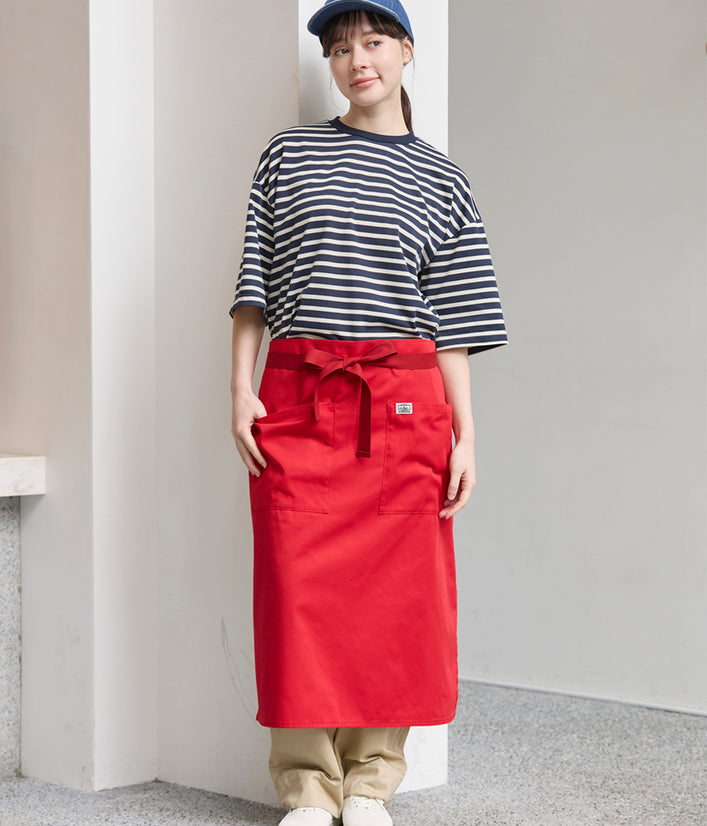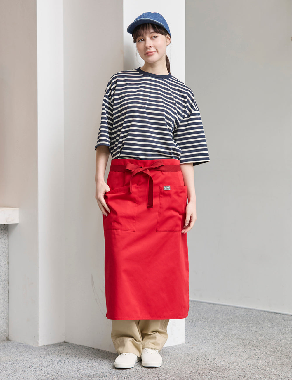 考えたエプロン。絶妙な丈感が程よいきちんと感を演出し、これ一枚でバリスタにもウェイターにもベイカーにも…幅広いスタイルにマッチします。